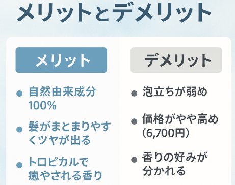 全体的に見ると、「香り・仕上がり・やさしさ」にこだわる人にぴったりのシャンプーですね。